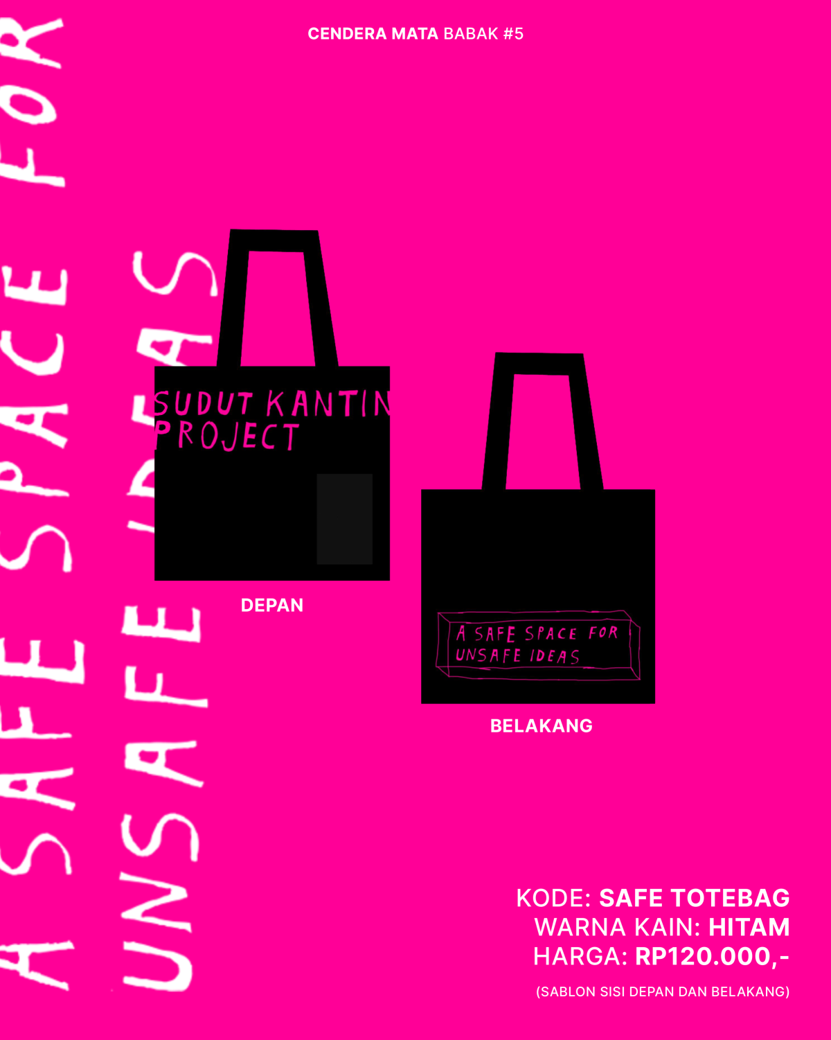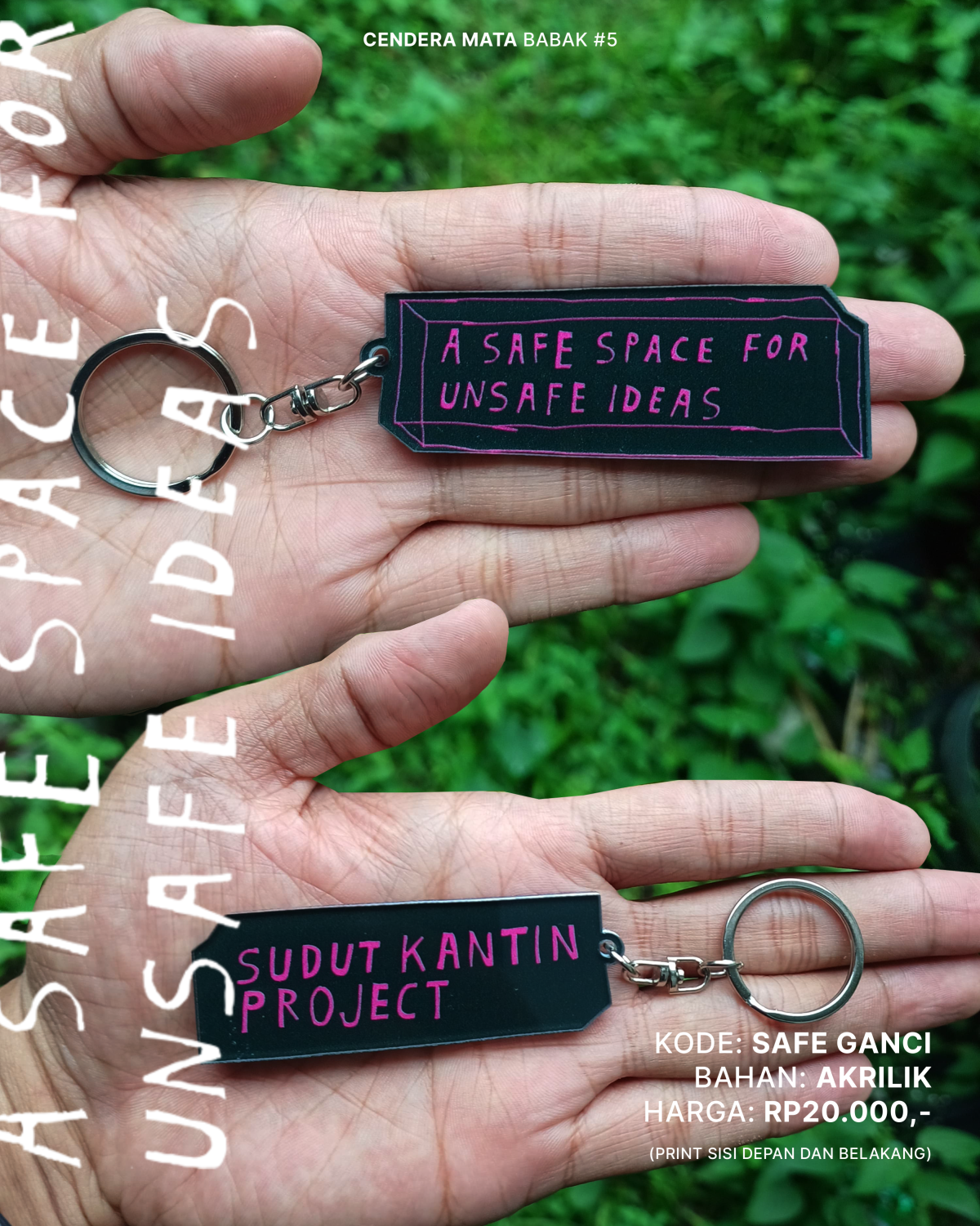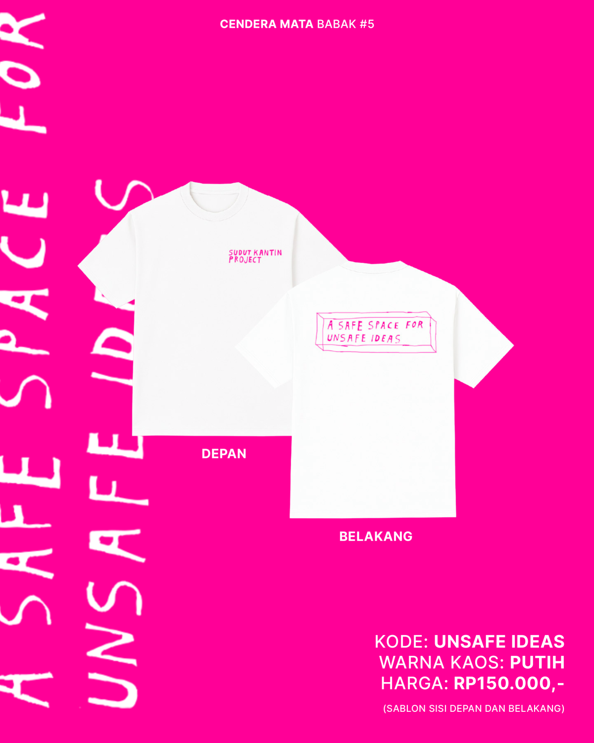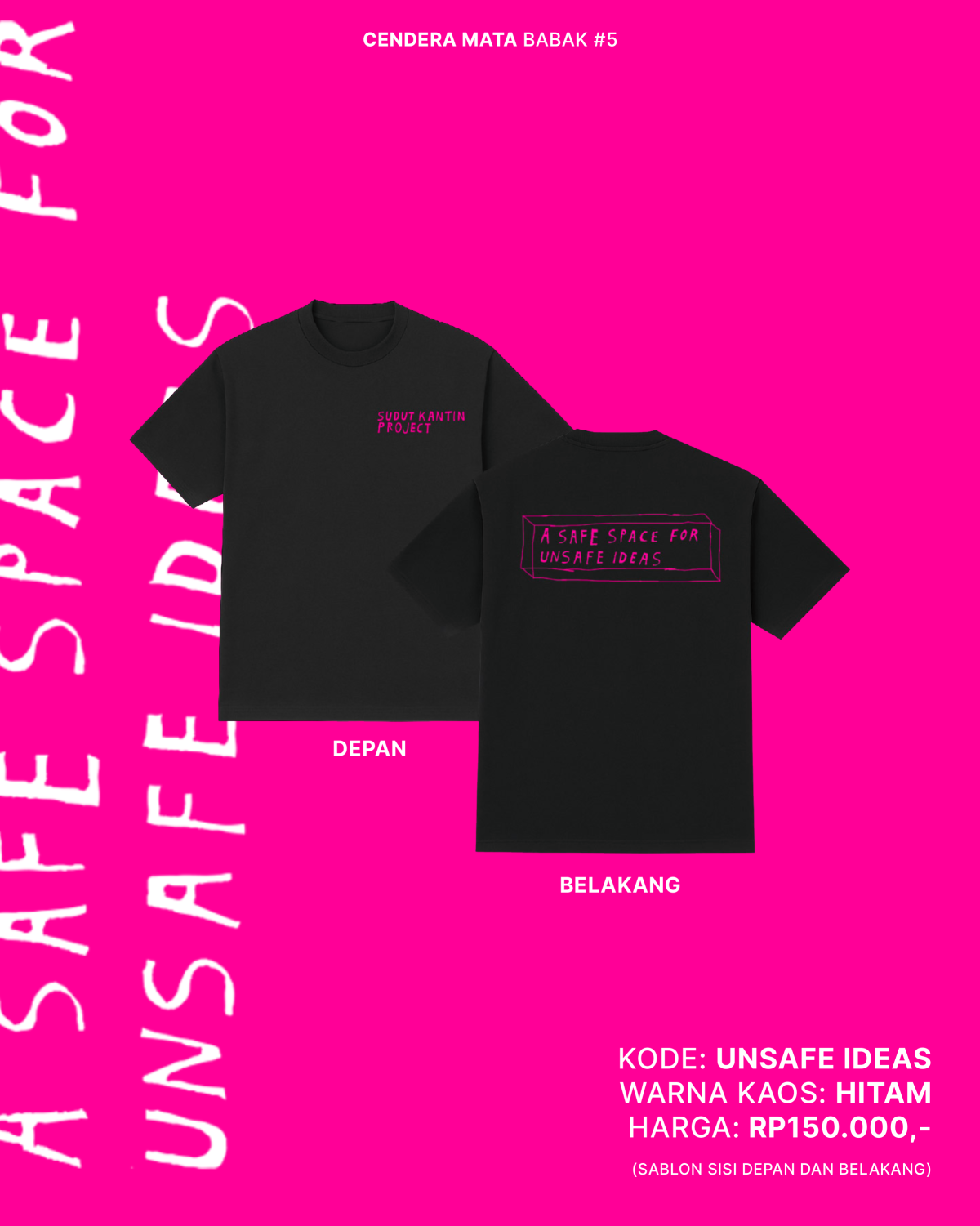 “A Safe Space for Unsafe Ideas” frasa yang kami racik sebagai semboyan untuk cendera mata babak #5. Sudut Kantin Project, kami bangun sebagai tempat eksplorasi ide-ide liar atau semacam ruang untuk mendengarkan kekacauan, menulis kebisingan, dan merayakan ketidakpastian.