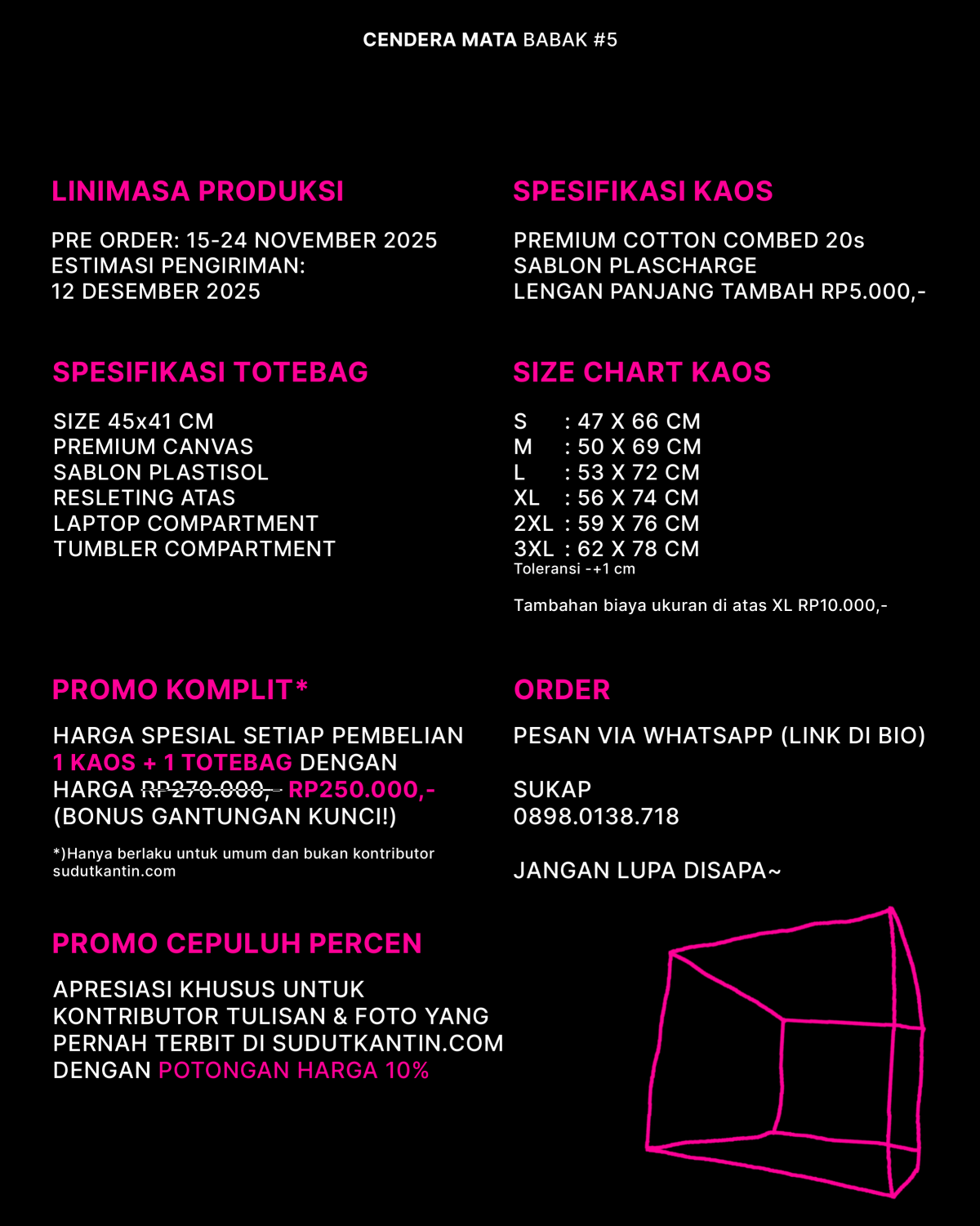 Seperti rilisan sebelumnya, cendera mata ini kami buat sebagai upaya bertahan: membiayai ruang “aman” kami di dunia maya, menambah umur website, dan menjaga nyala kerja-kerja pengarsipan, liputan amatir, serta distribusi tulisan para penulis dari berbagai penjuru yang hadir tiap satuan waktu.