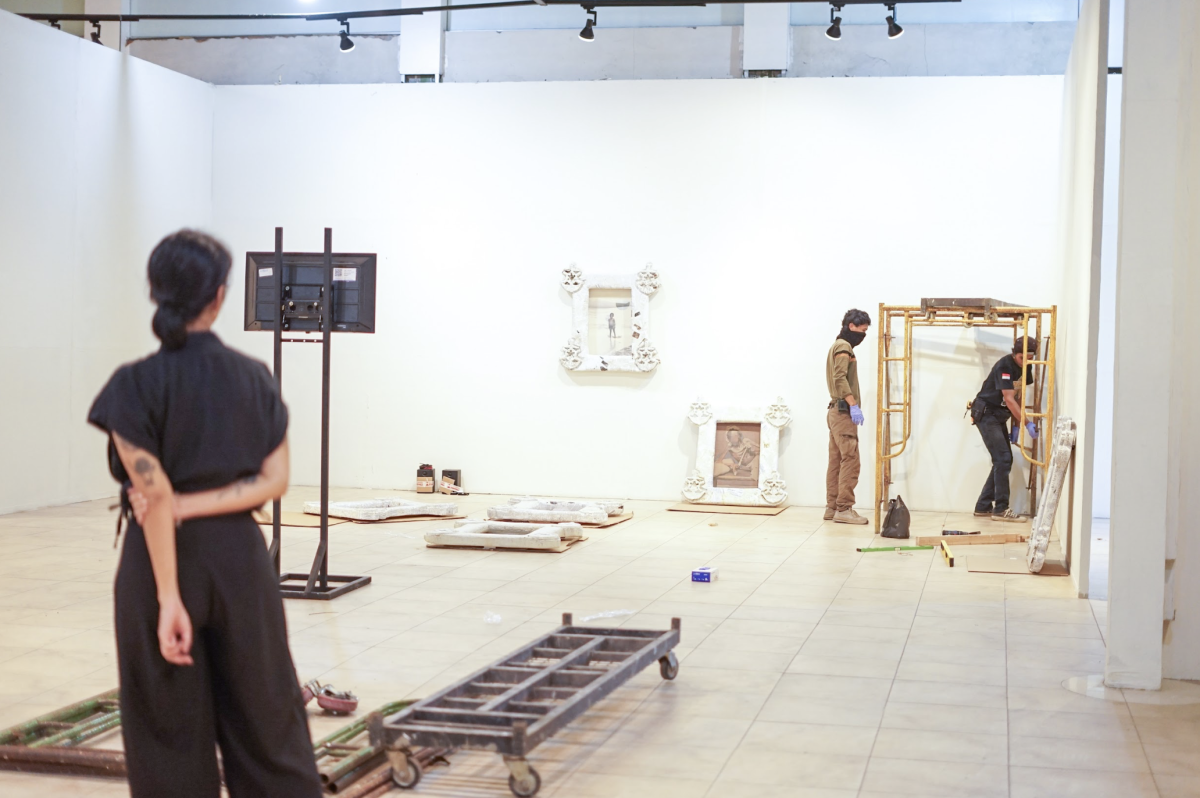 Proses pasang karya seni “History Then and Now: Who is Who? (1800s)” karya Syaura Qatrunadha (dok. Biennale Jogja 18)