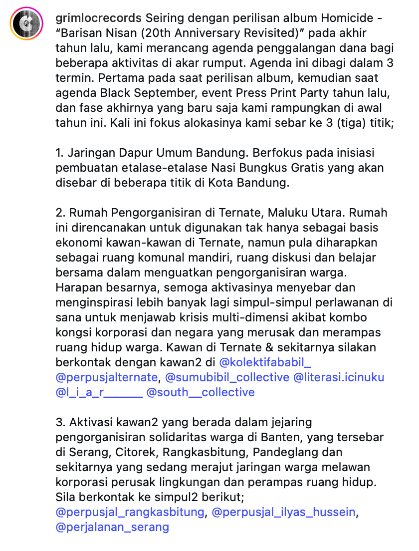 Salah satunya saya menggunakan penjualan kaos Homicide yang melacurkan kaos Homicide. Wey beli dong kaos gue, untuk mendanai gerakan. Maksudnya dalam konteks sangat paradoks, itu paradoks. Tapi realistis di zaman kalau kita mau mendanai gerakan, ada kebutuhan buat dapur umum, untuk kawan-kawan di Halmahera untuk bikin ruang pengorganisiran, dan lain sebagainya.