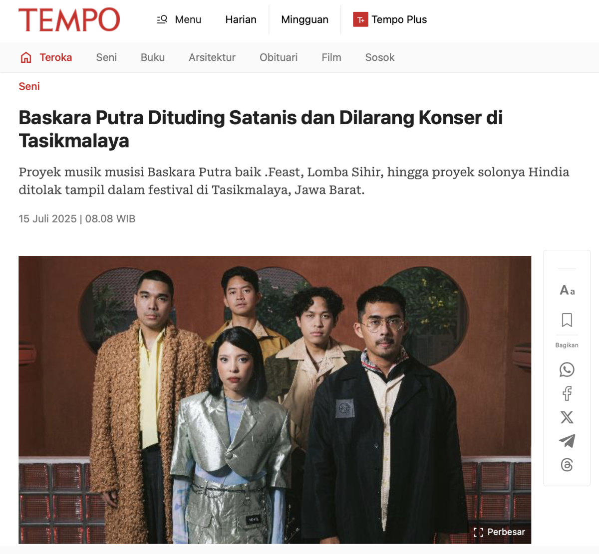 Belakangan ini, ramai di jagat maya tentang penolakan konser Hindia di Tasikmalaya oleh sejumlah organisasi masyarakat dan aktivis di sana. Alasannya? Hindia dianggap menyebarkan paham satanisme yang dikhawatirkan bisa mengganggu keyakinan seseorang. Penolakan ini didasari oleh lirik yang ditulis oleh Baskara pada lagu  “Matahari Tenggelam.” Dalam lagu itu terdapat lirik yang kontroversial: Kudoakan kita semua masuk neraka.” Selain itu, penolakan ini juga dipicu oleh beberapa konser Hindia yang mengusung tema analog horor.