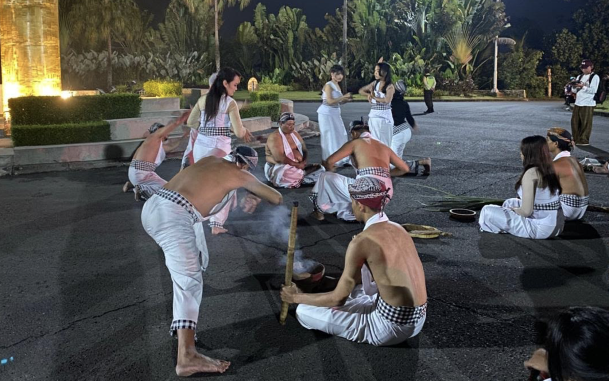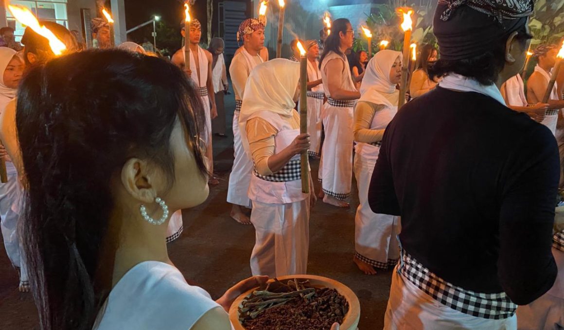 Teater Djarum menamai pertunjukan malam itu Puja Doa Kretek. Mereka berbaris melingkar, mengenakan kain putih dan selendang kotak hitam-putih di pinggang. Gerak mereka pelan, nyaris seperti doa. Di tengah lingkaran, seorang perempuan menunduk membawa wadah berisi campuran rempah, sementara obor-obor diangkat tinggi ke langit. Api berpendar di wajah para pelaku ritual; tiap nyala seperti jiwa yang berbicara. Tidak ada kata, hanya desah napas, denting bambu, dan bunyi daun kering yang terinjak pelan.