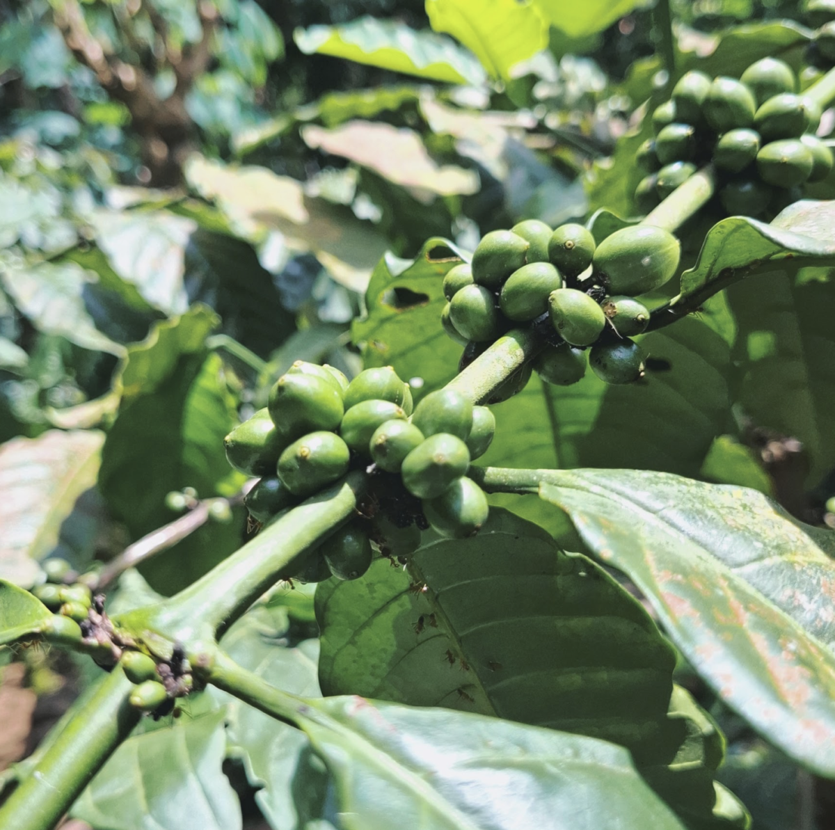 Kopi yang ia tanam merupakan jenis kopi robusta. Sudah setahun kopi ini mereka tanam. Ini adalah buah pertamanya. Buahnya maish hijau dan kemungkinan dipanen masih sekitar 3 bulanan lagi. “Ini baru pertama kali berbuah,” jelasnya singkat.