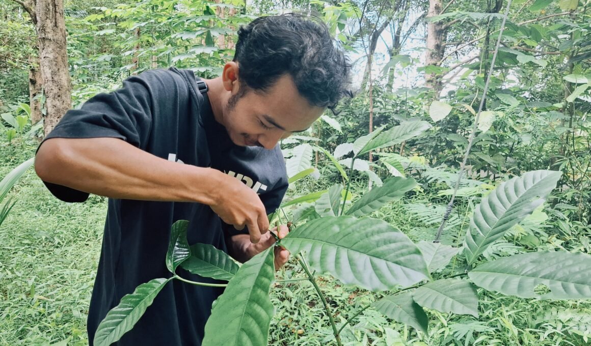 Kopi yang ia tanam merupakan jenis kopi robusta. Sudah setahun kopi ini mereka tanam. Ini adalah buah pertamanya. Buahnya maish hijau dan kemungkinan dipanen masih sekitar 3 bulanan lagi. “Ini baru pertama kali berbuah,” jelasnya singkat.